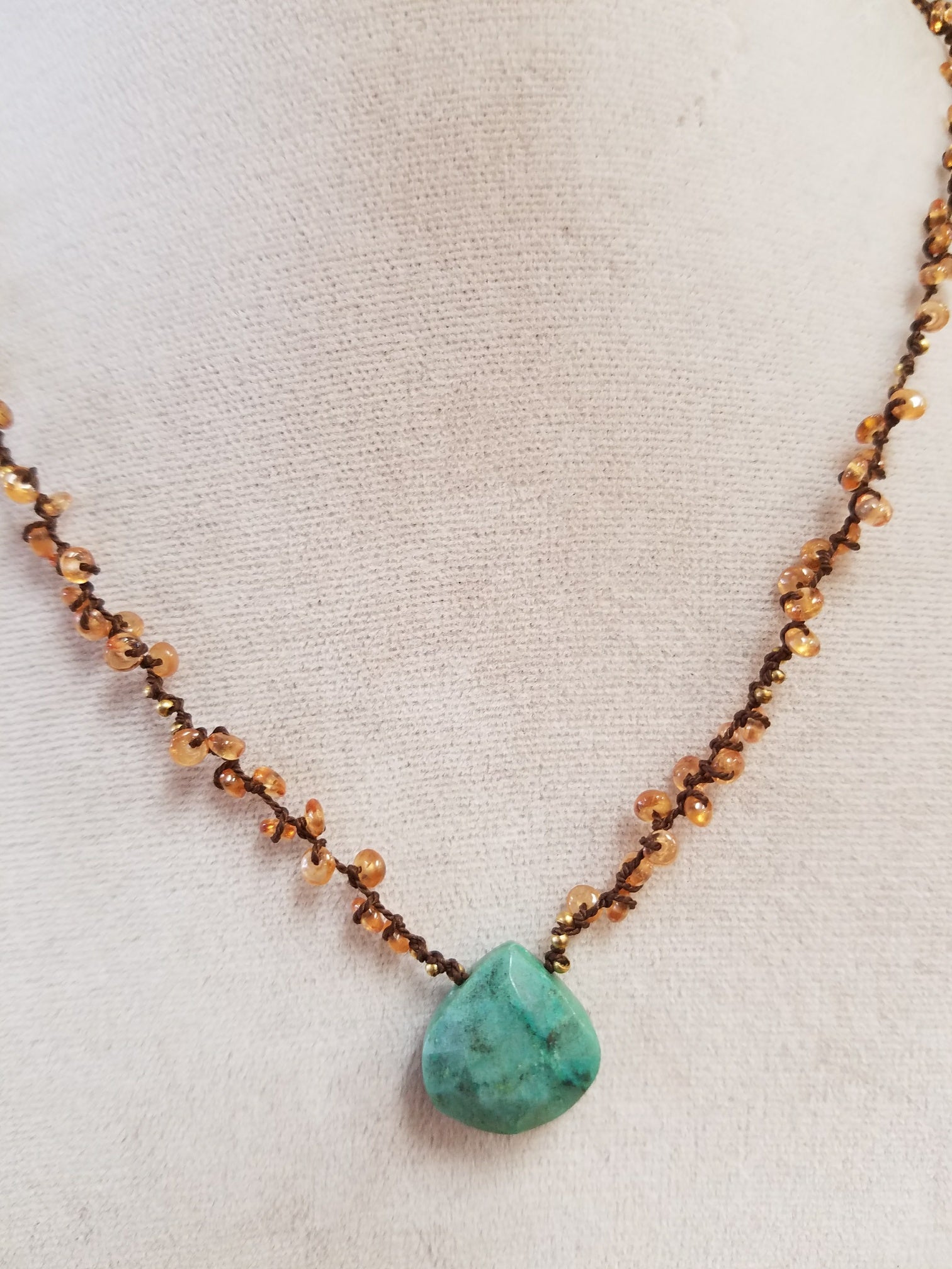 Dainty Mandarin Garnet (Spessartite) hover the pretty silk thread and the Amazonite center piece. 16" with gold filled clasp.