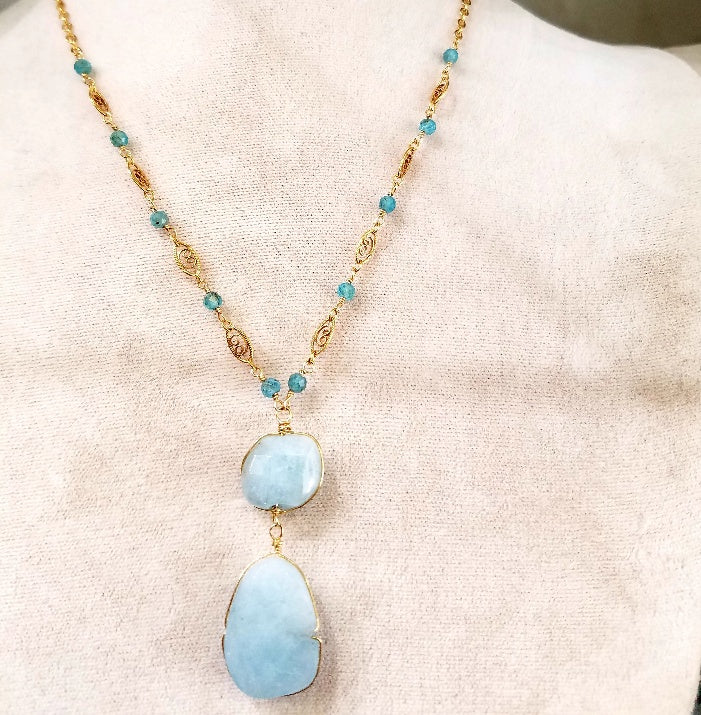 Strong center piece crafted with two sizes of Aquamarines are the focal point of this necklace. Antique bar chain and blue Apatite gems are holding the Aqua center. 16", gold filled