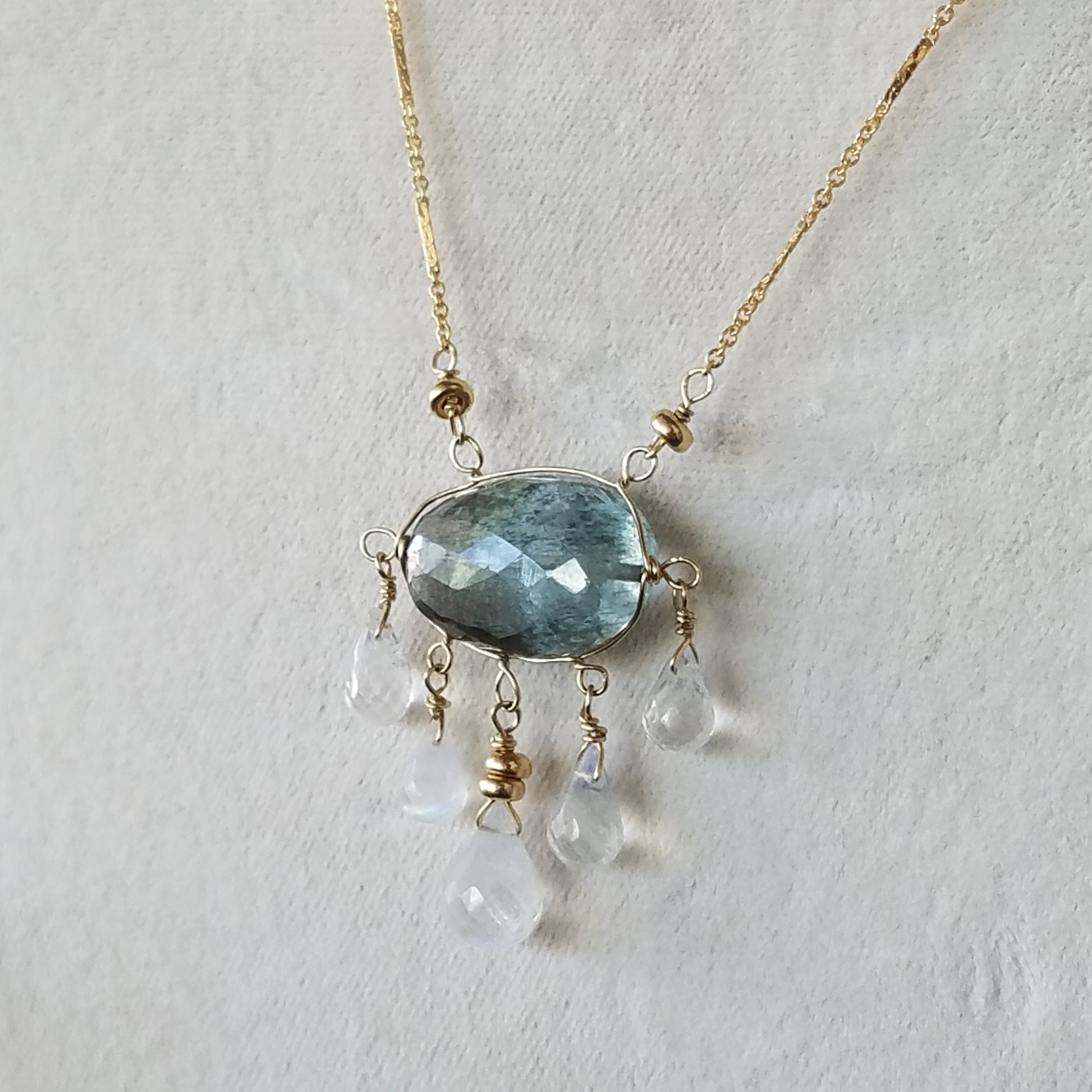 Faceted Aquamarine (about 3/4" long and 1/2" wide) wrapped with gold filled wire and holding five drops of Rainbow Moonstone. The gems are attached to a bar chain that takes you back to the victorian era. Made in LA. about 16" long.