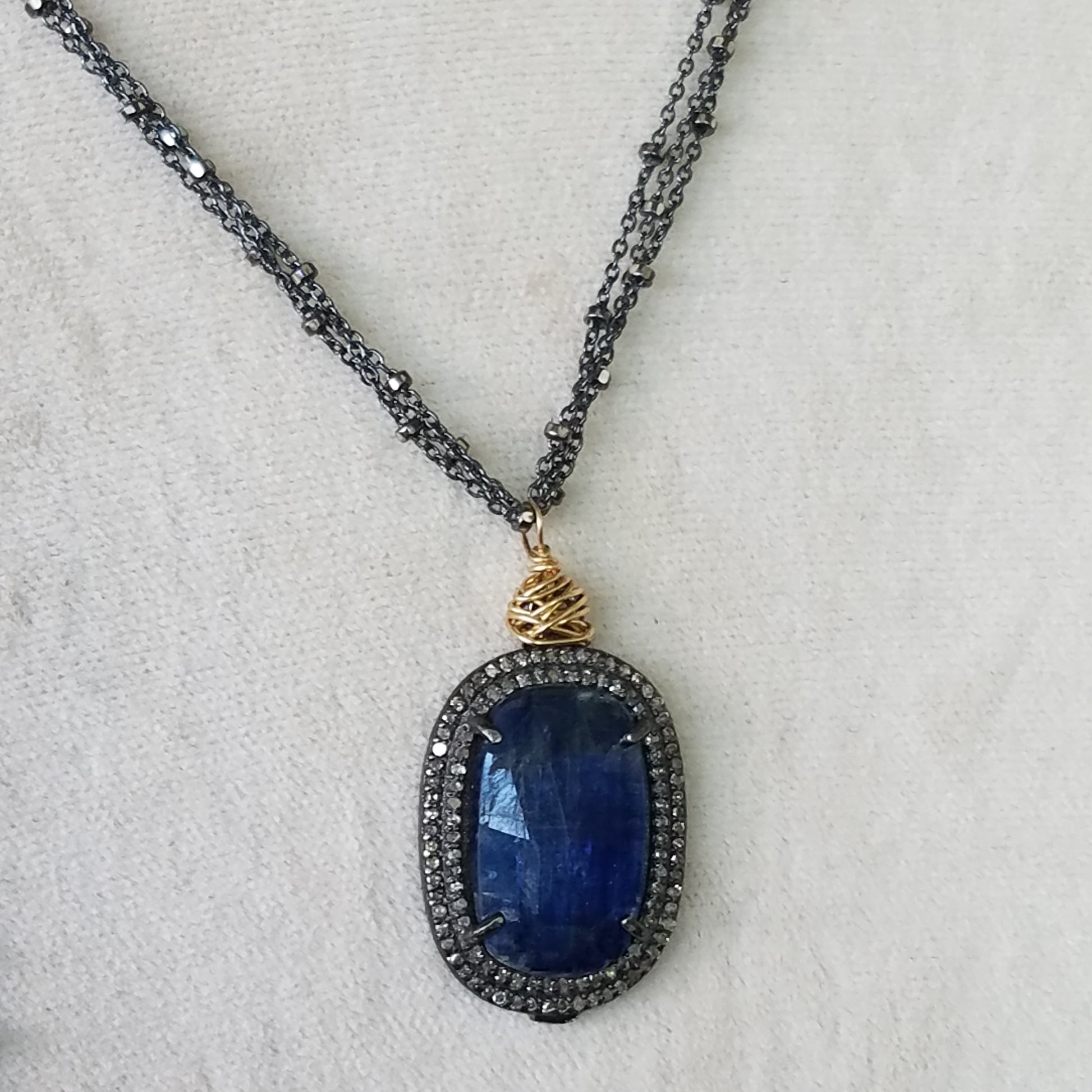 Blue Kyanite surrounded by two rows of Diamonds, set in sterling silver and plated with Rhodium. Trio of a chain is oxidized and plated as well, about 17" long necklace.
