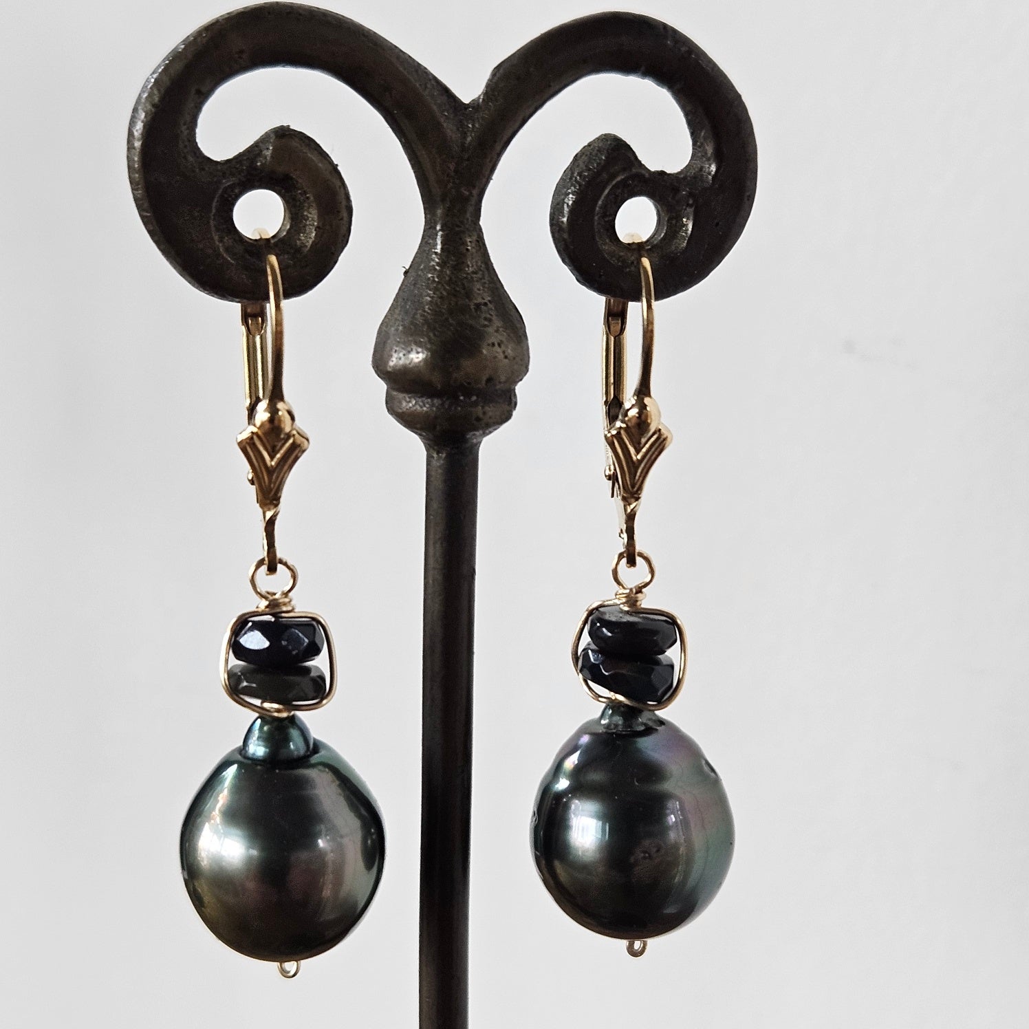 Blue opal Tahitian earrings with lever backas, gold filled about 1 1/2" long.