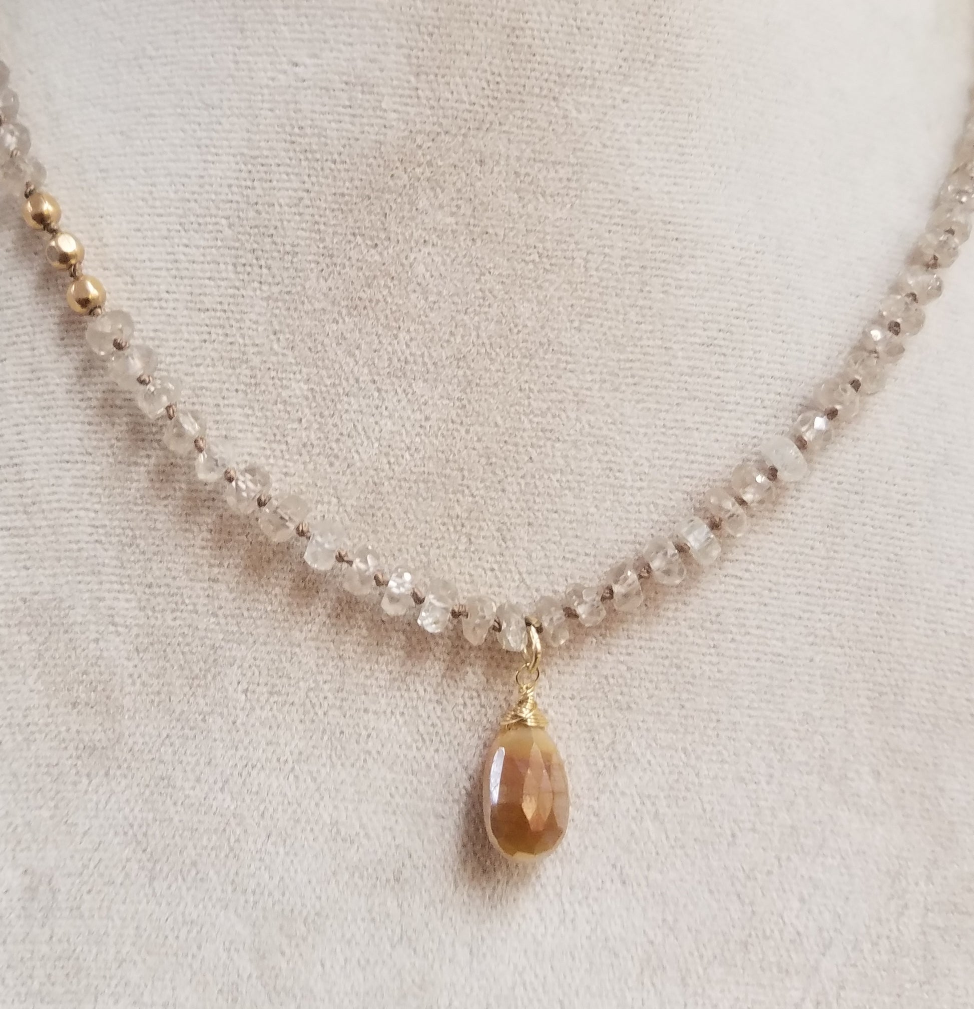 Zircon is known for its brilliance. Obvious in this necklace. Knotted between each Zircon bead, crafting a flowing necklace. 14 inches, Moonstone pendant. Gold filled clasp and findings.