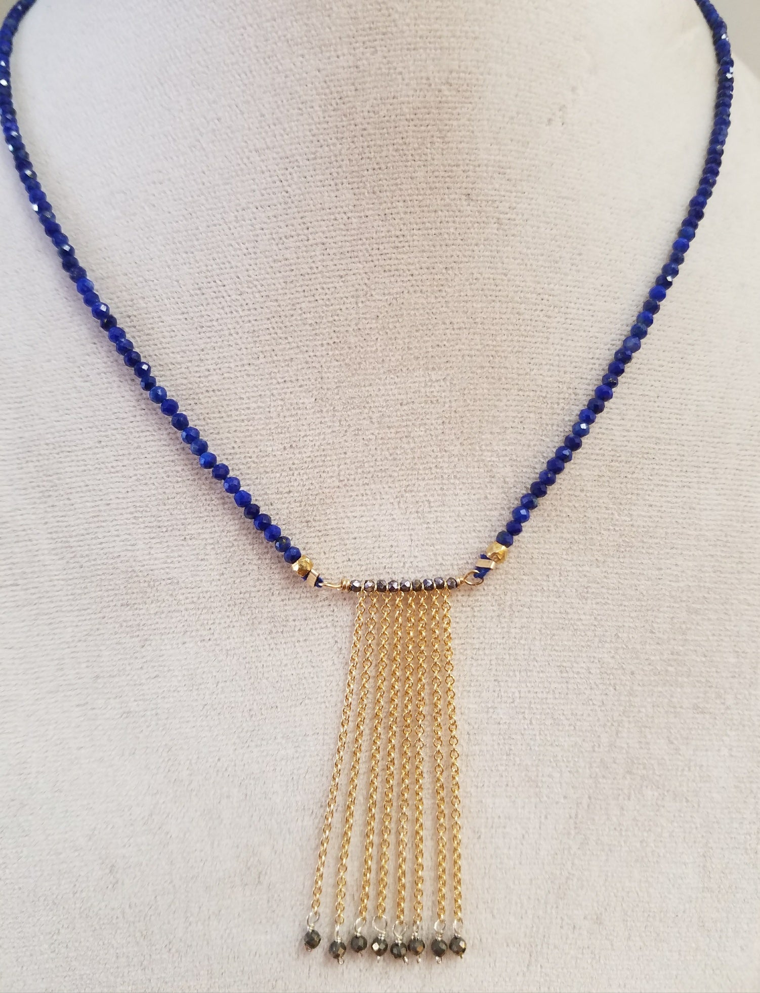 Faceted and deep blue Lapis marries the ends of a gold filled fringe. 16" long, the fringe is about 1 3/4 inch long.