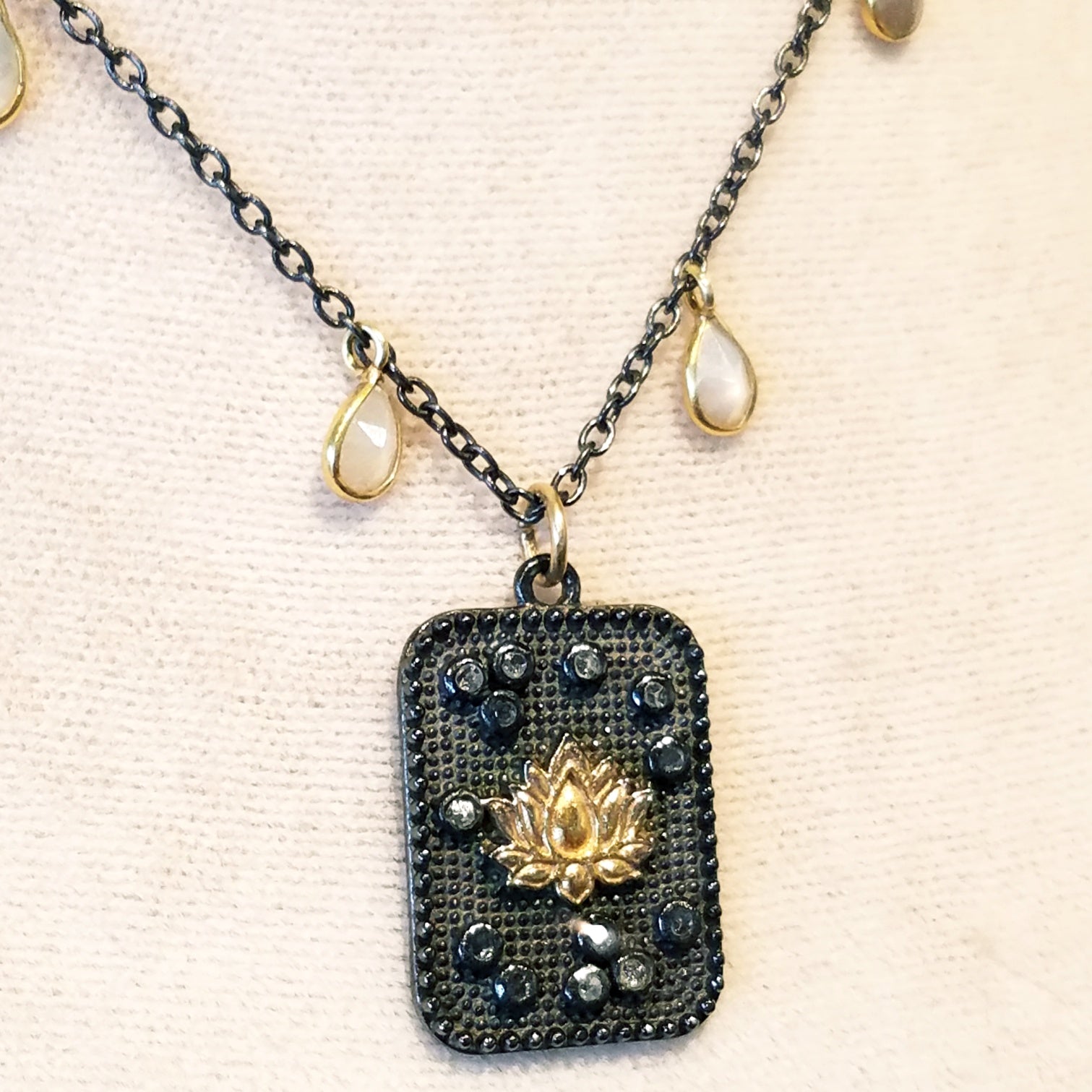 Golden Lotus and scattered Diamonds pendant, oxidized and coated with Rhodium. Drops of Moonstone are hanging on the chain enhancing the sparkle of the pendant.