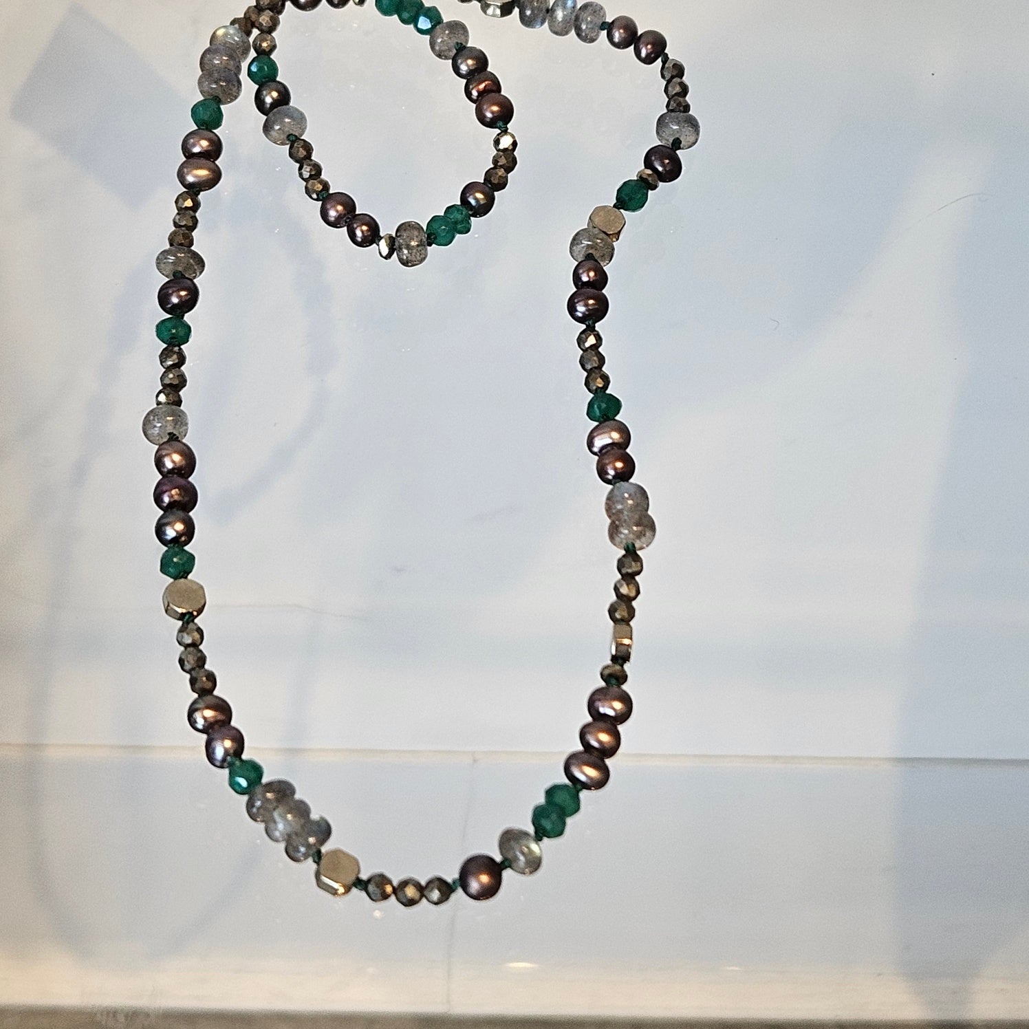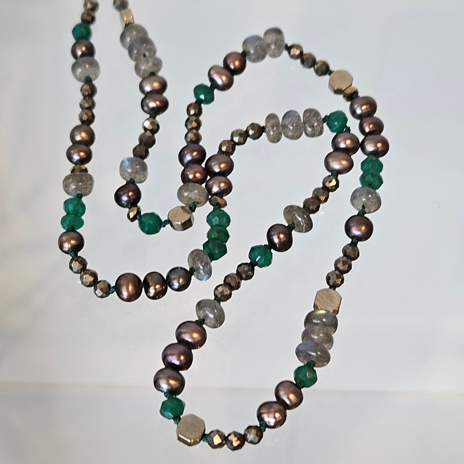 16" of harmony in shades and shapes. Handcrafted with Labradorite, Golden Pyrite Pearls and Green Onyx.
