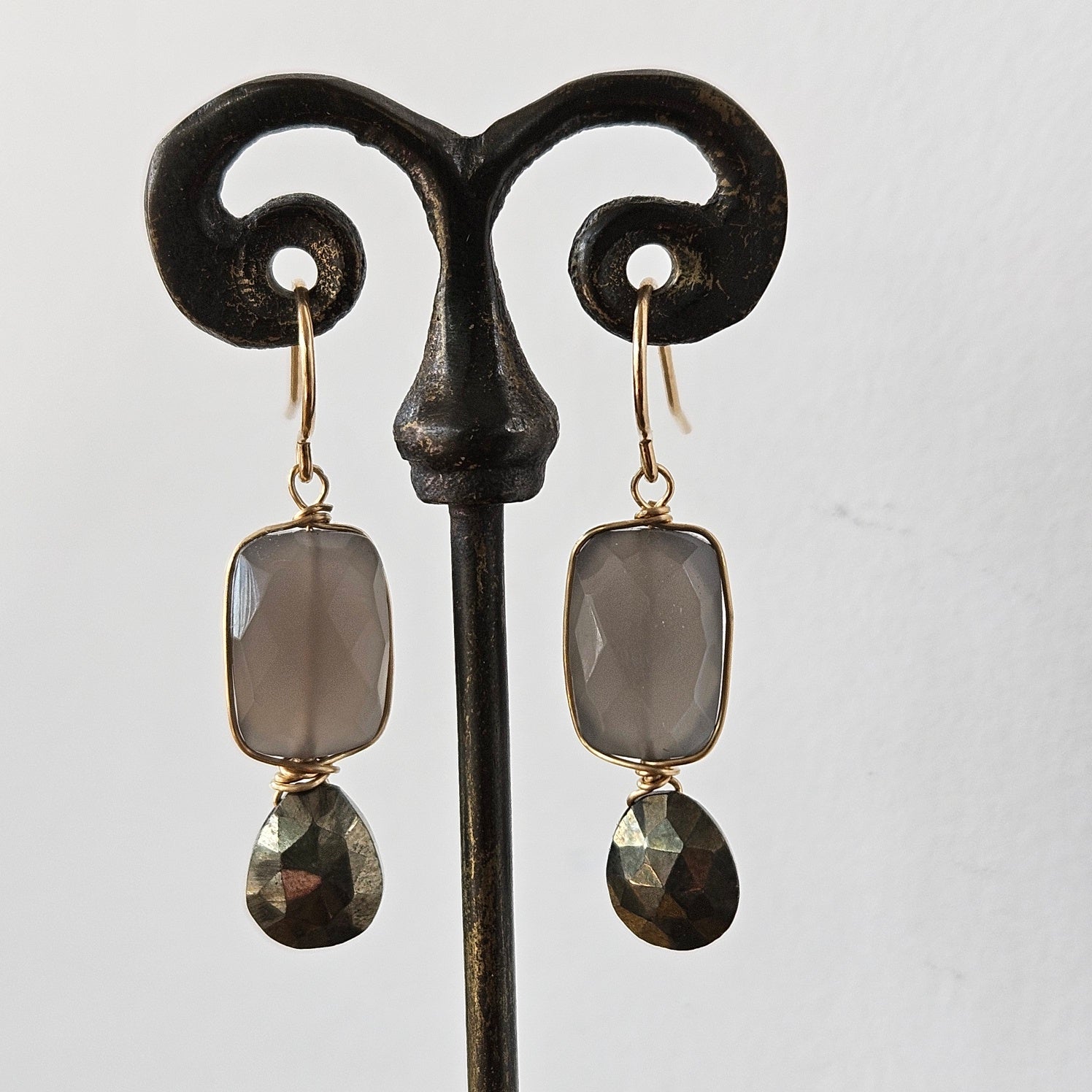 Faceted Grey Moonstone wrapped with gold filled wire and attached to the Pyrite crafted an earrings about 1 1/4" long.