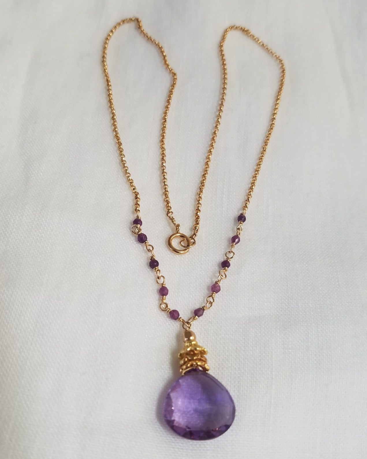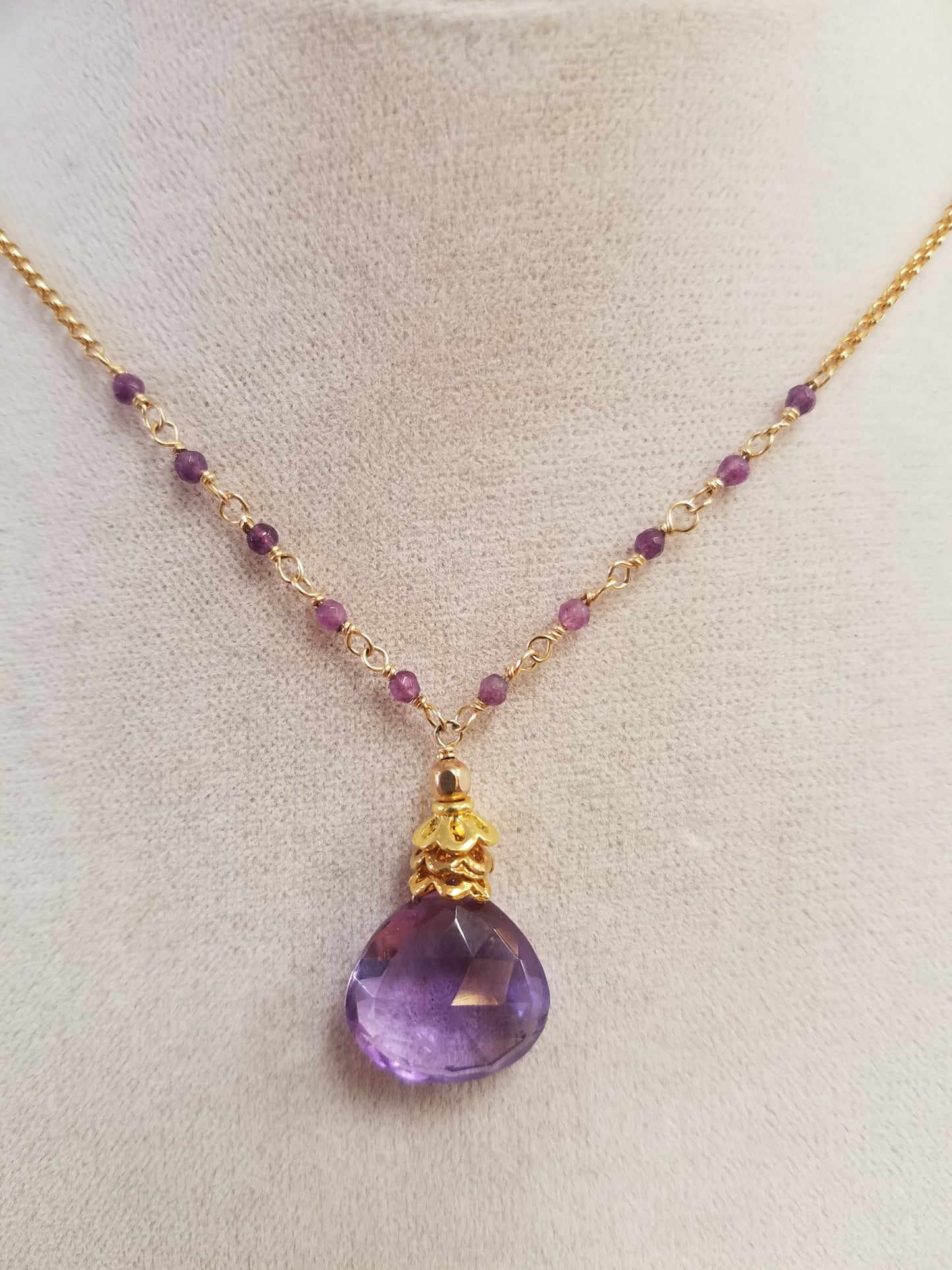 Large Amethyst hanging from the gold filled chain and the wire wrapped little amethyst. Drop is capped with gold plated findings and completed with gold filled bead. 17 inches long necklace. The width of center Amethyst is 1/2 inch.