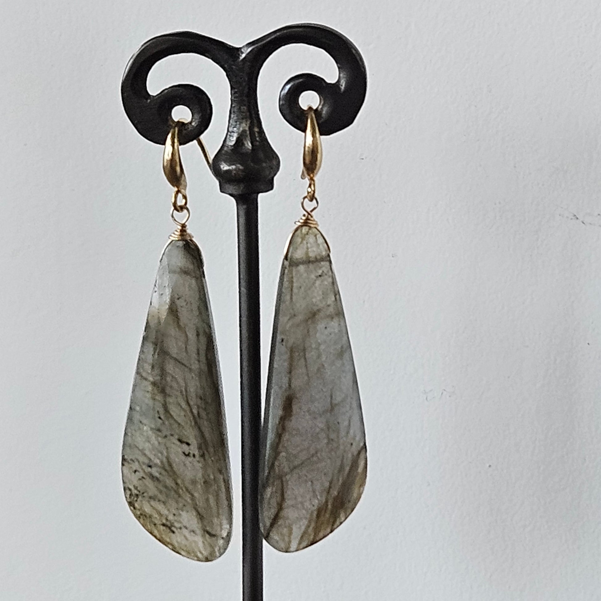 Triangular and Large Labradorite gem crafting an amazing pair of earrings, about 2 1/4" long.