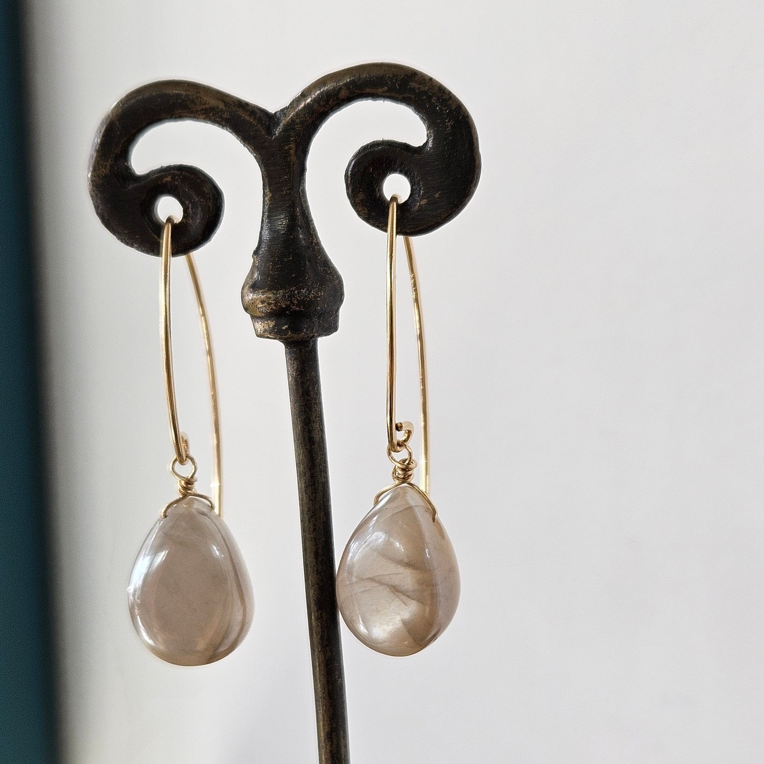 Teardrop Lustrous Moonstone hanging on a long ear wire crafting a neutral tone pair of earrings, about 1 1/2" long, gold filled.