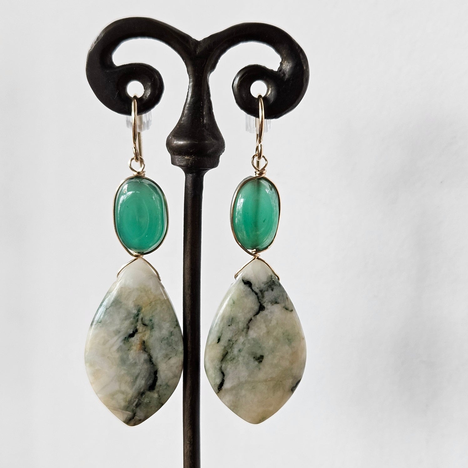 Large Mariposte tear drops attached to oval Green Onyx earrings, gold filled, about 2" long.
