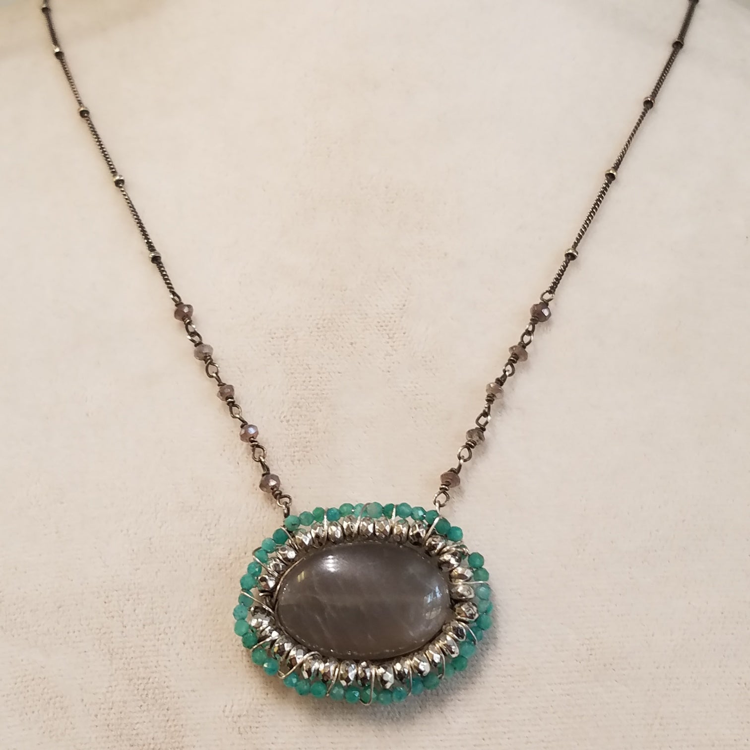 Amazonite and Pyrite embroidered (kind of) with a silver wire to the encased Grey Moonstone. The pendant is attached to the chain by tiny wrapped Moonstones. 16" long, Sterling silver.