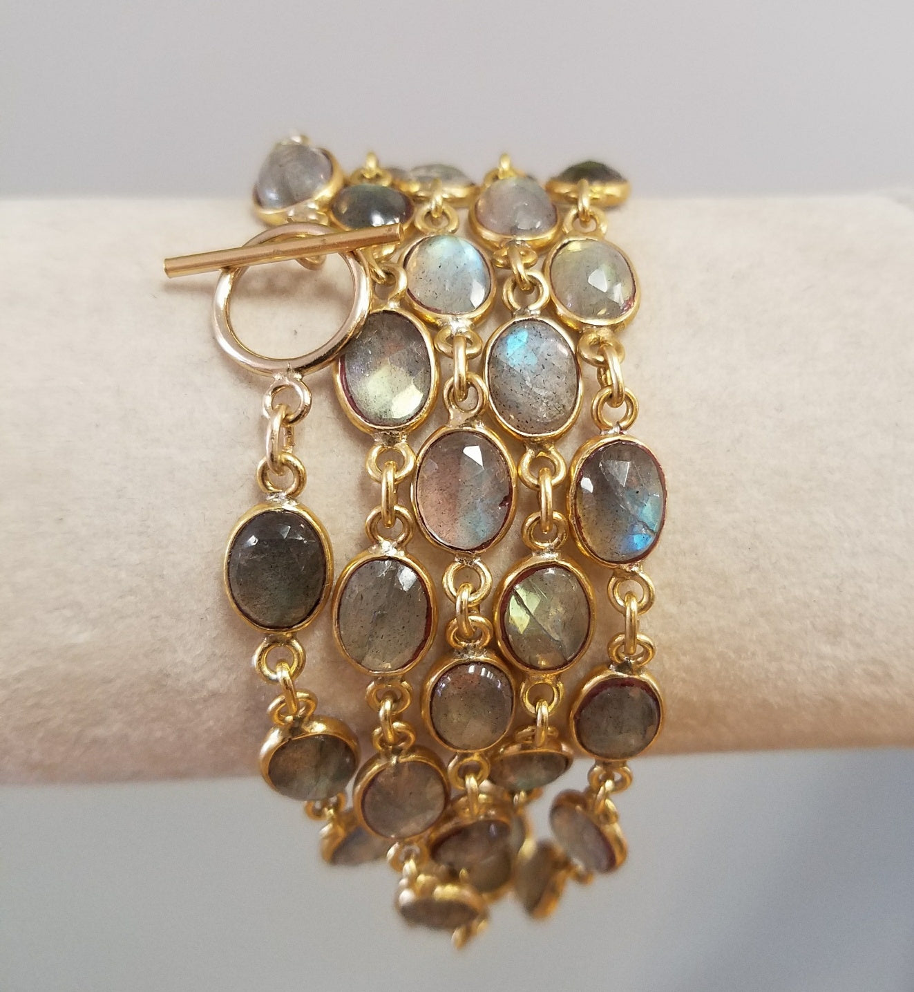 Enclosed faceted Labradorite, create either a long necklace (36 inches), or can be wrapped around your wrist 5 times. Extremely comfortable! gold plated over silver with a toggle clasp.