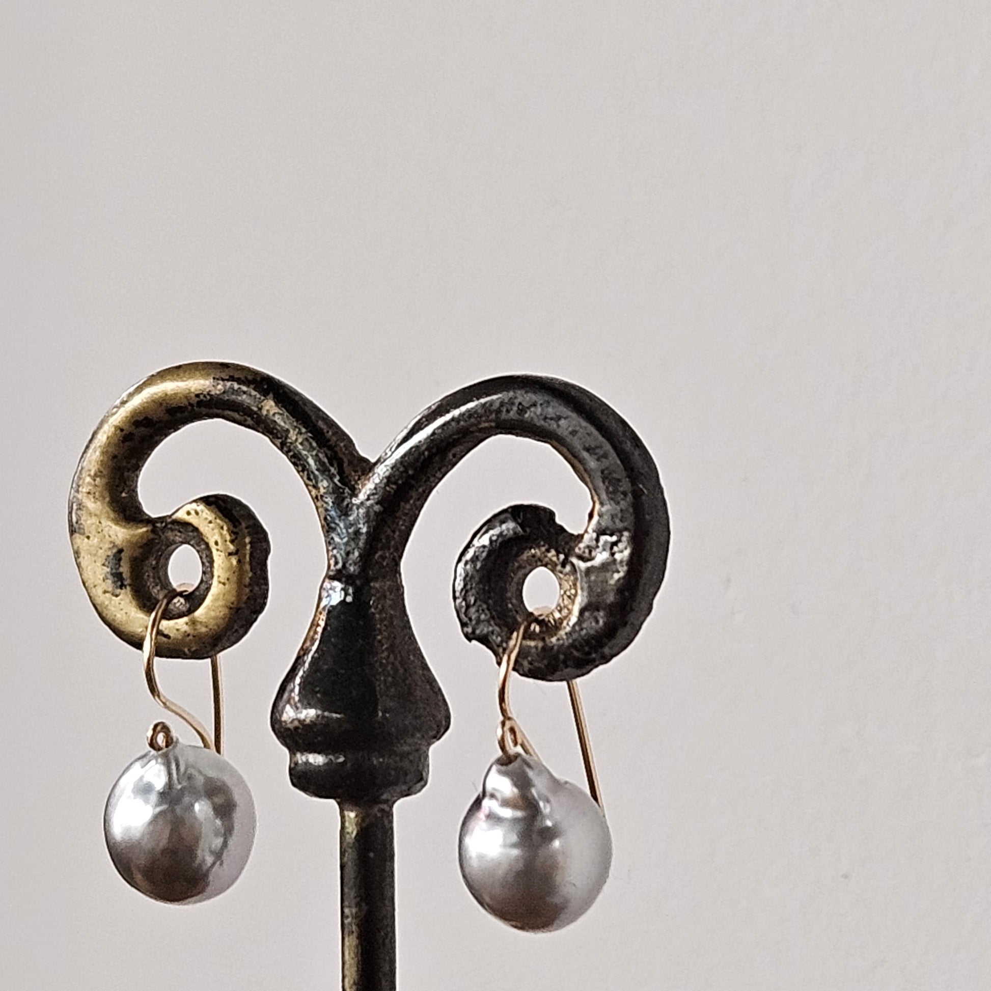 Silver Tahitian Pearls with a gorgeous luster and tear drop shape crafting a pair of earrings, that is easy to wear always, about 1/2" long. Gold filled.