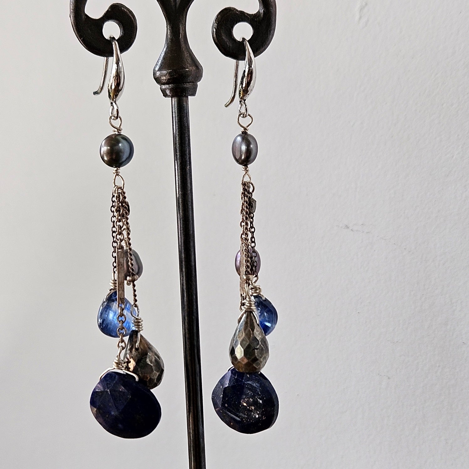 Lapis, Kyanite, Pyrite and Pearls dancing with silver chains and links crafting a dynamic kind of earrings, about 2 1/2" long.