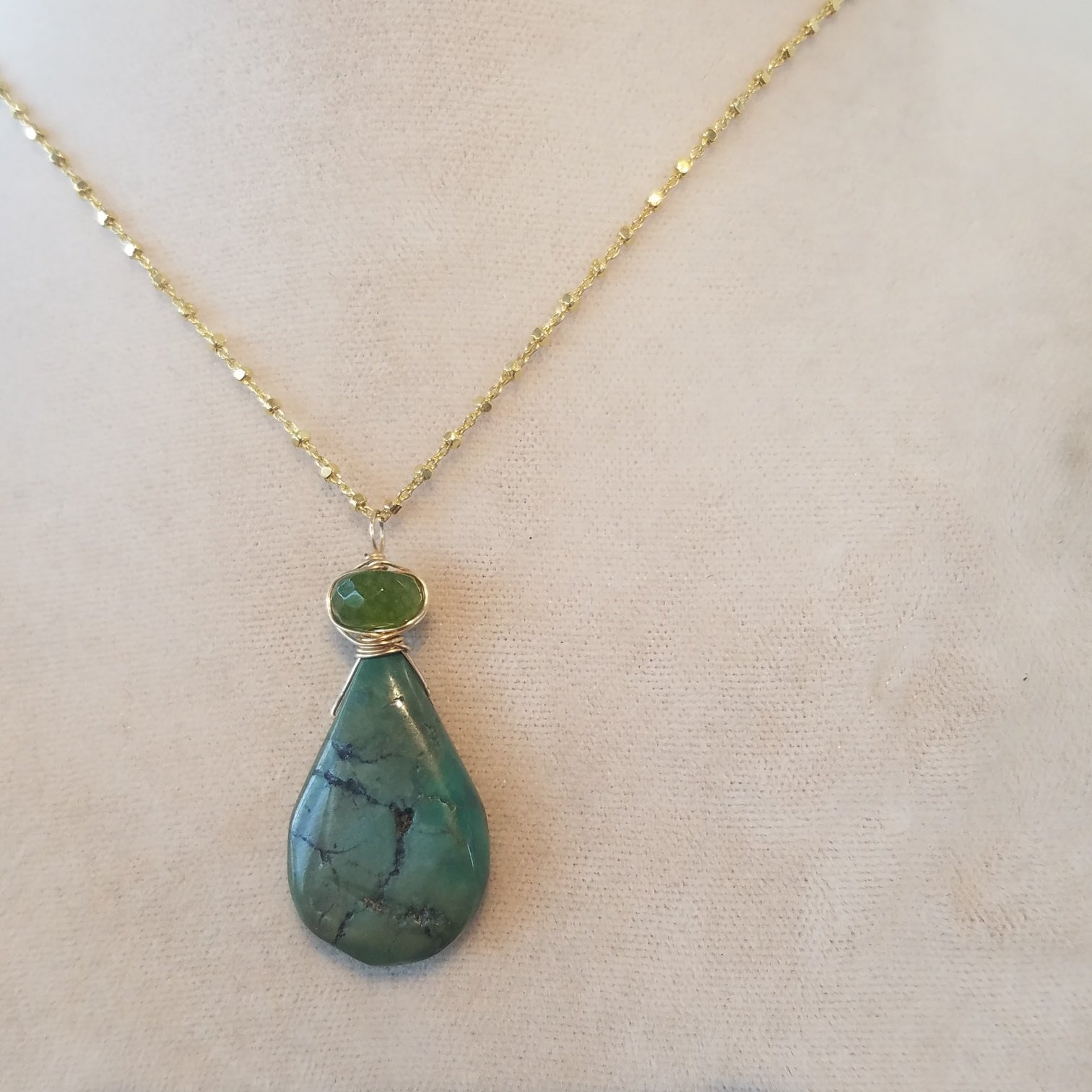 Turquoise and Jade pendant hanging on a gold over silver chain. 16" necklace.