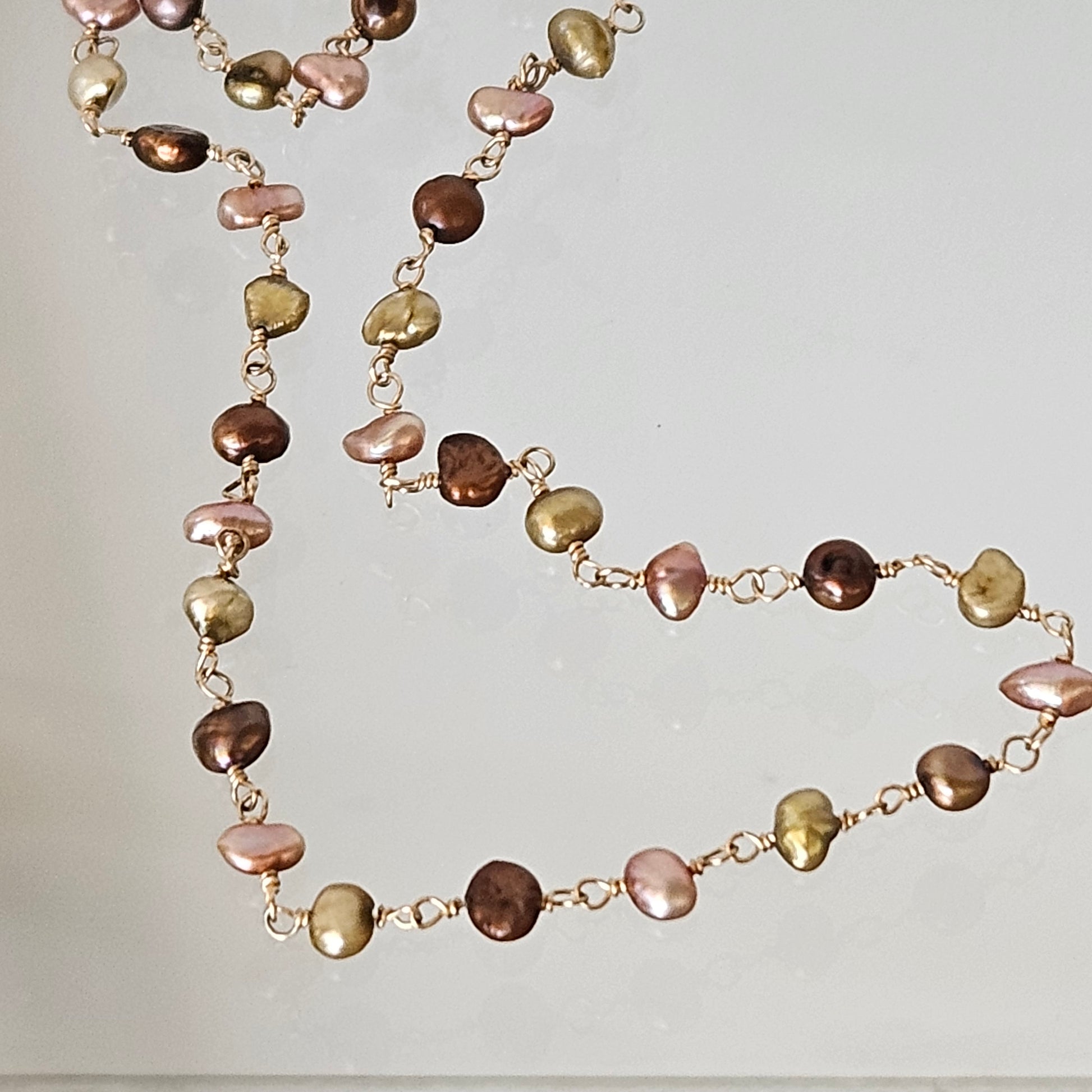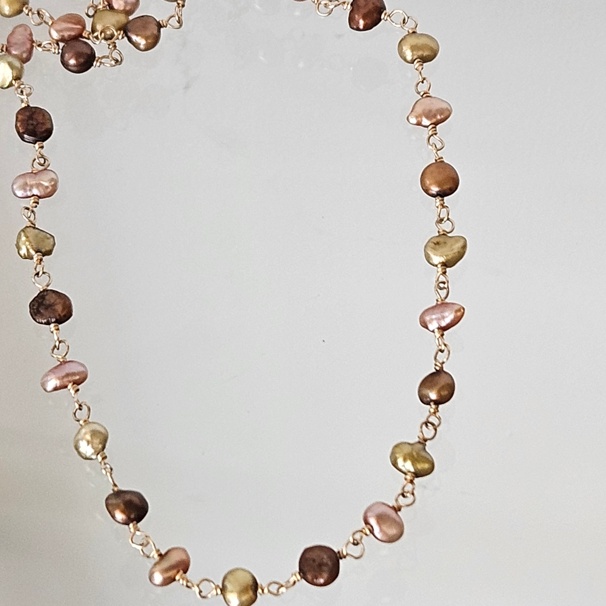 Small Pearls (about 5mm) are wire wrapped crafting a16" long necklace made with gold filled wire. This necklace would work well for layering!